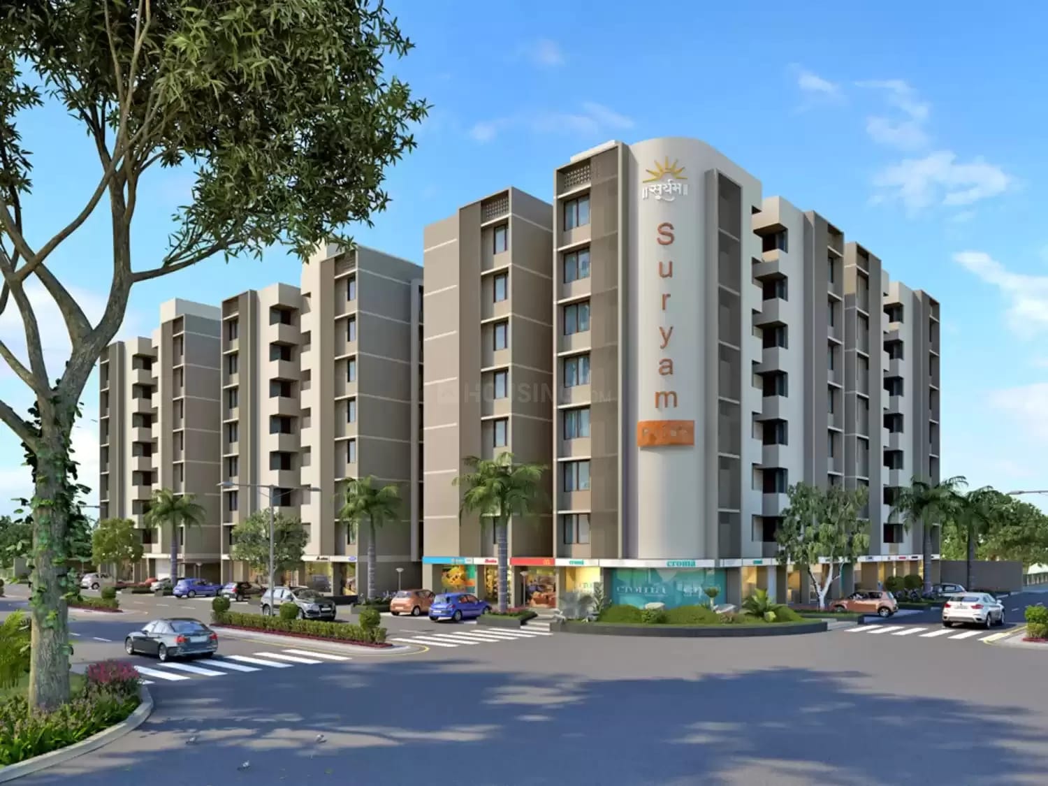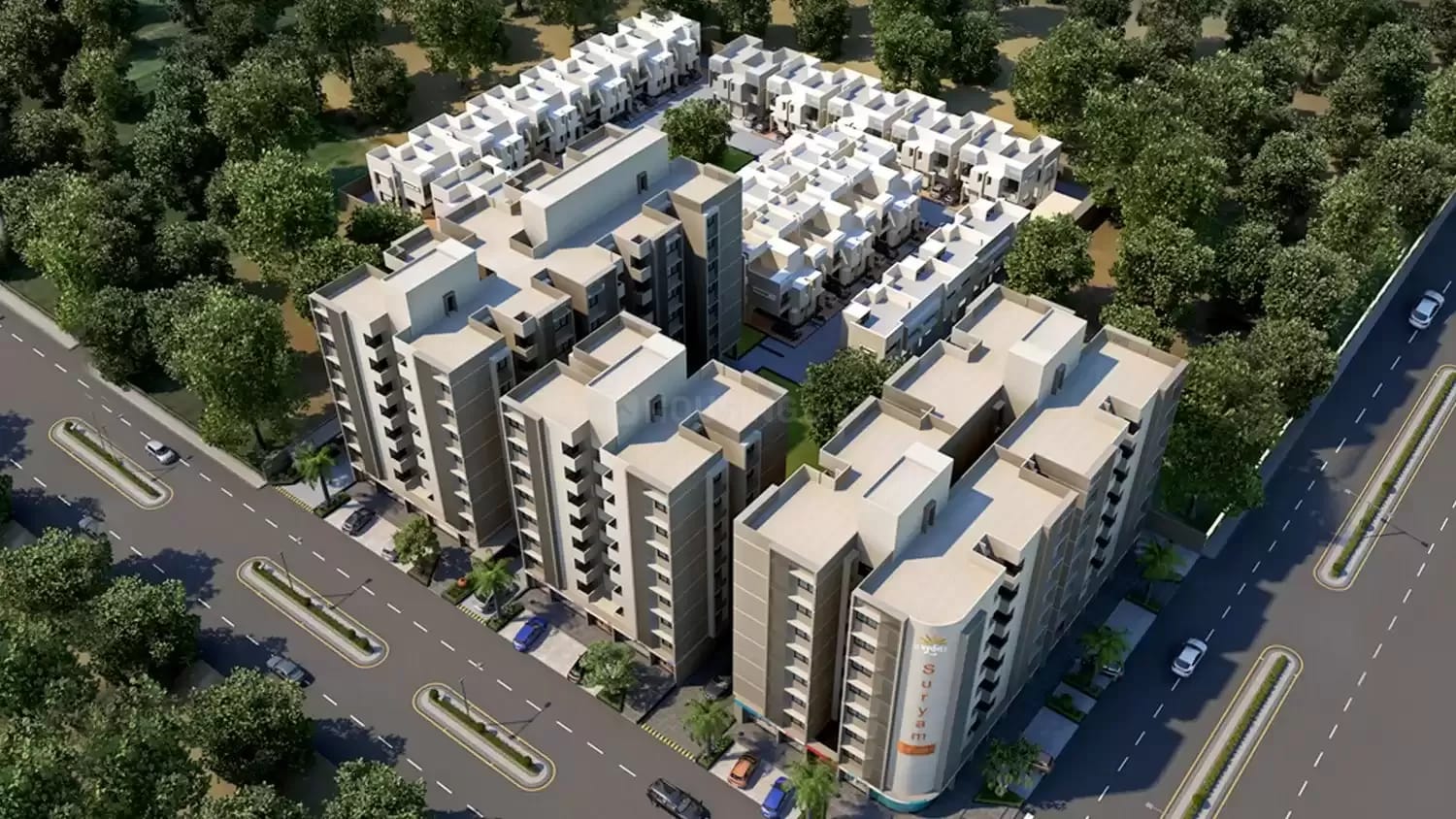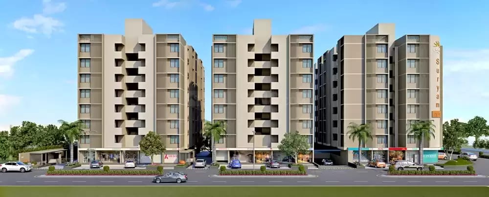 JV with Aarshis Infrabuild — a 2,15,000 sq.ft. 7-storey residential complex (154 units) and a 47,000 sq.ft. bungalow township (41 units) for Suryam Group, delivered on schedule.
