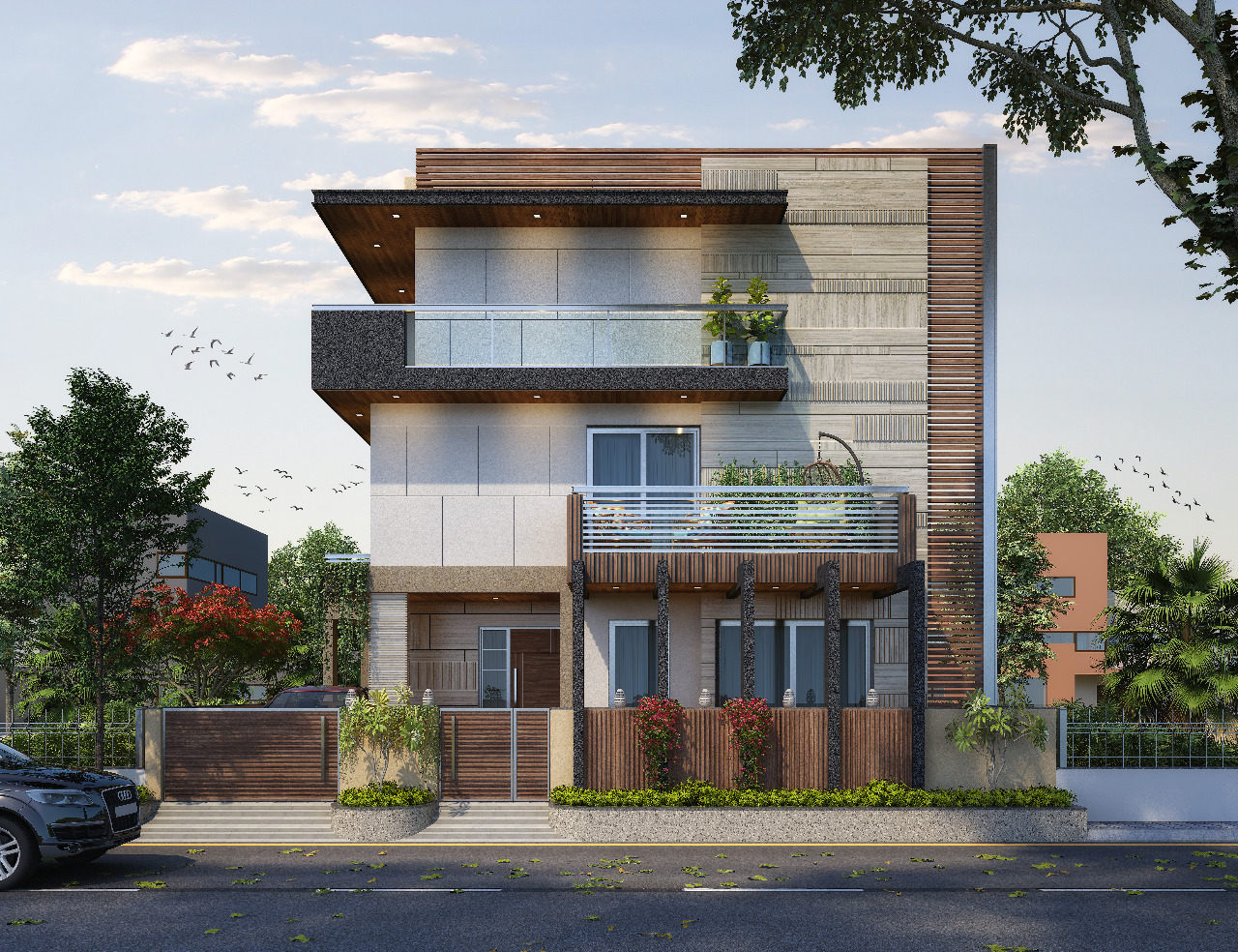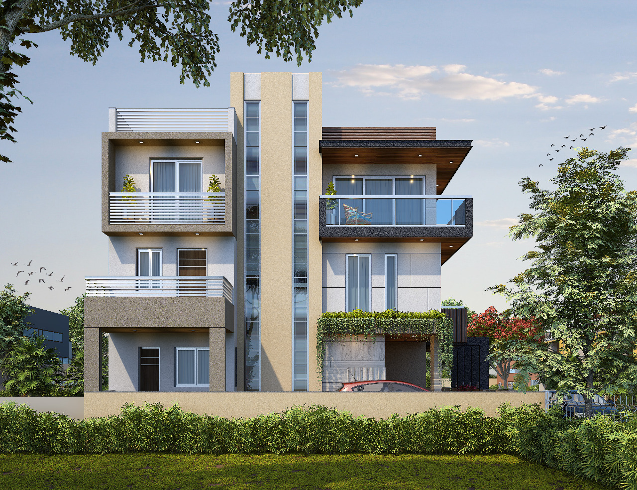 Expanded into full-service architect + interior work. Completed multiple residential bungalows (2,600–5,000 sq.ft.) and office interiors in Ahmedabad, lock and key delivered.